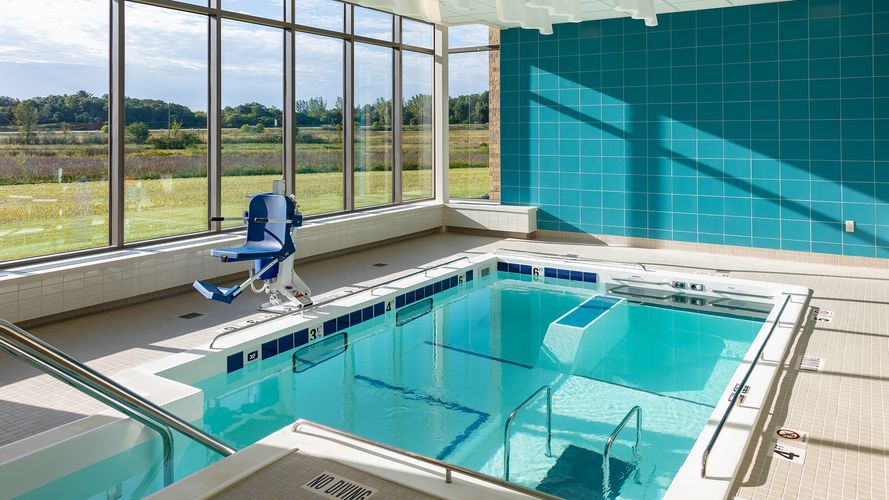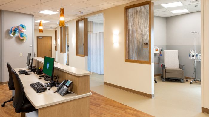 Additional spaces include a primary and specialty care clinic with eight exam rooms, an imaging suite, a rehabilitation area with a hydrotherapy pool, a cafeteria, and infusion, lab, pharmacy, administration, and support spaces.