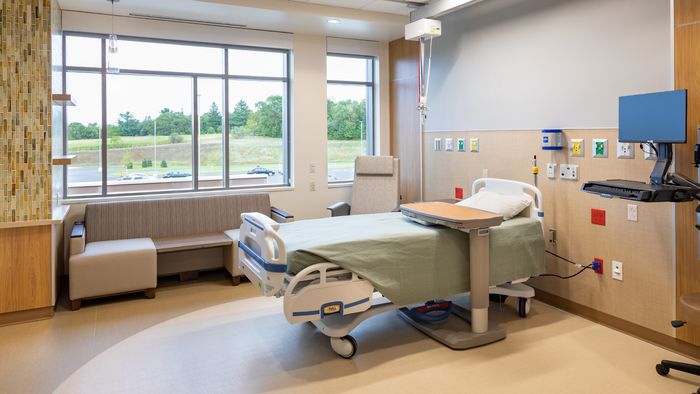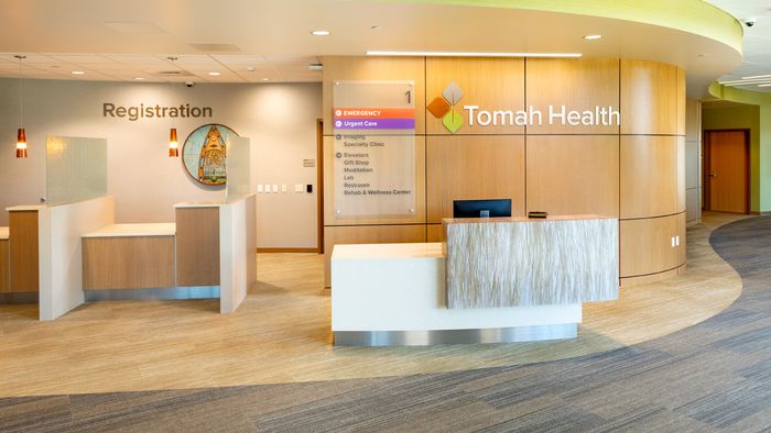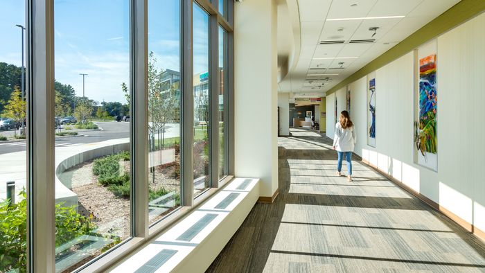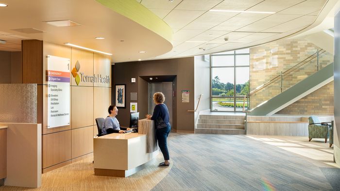 The three-story aesthetically appealing building features a glass-walled, two-story entry atrium. The urgent care/emergency department has 12 treatment rooms and a two-bay ambulance garage, the surgery area has two procedure rooms and four operating rooms, and the OB/birthing suites come complete with water birthing tubs.