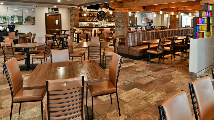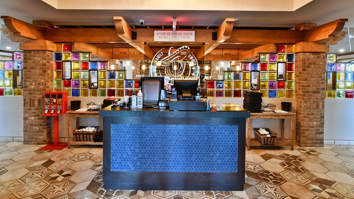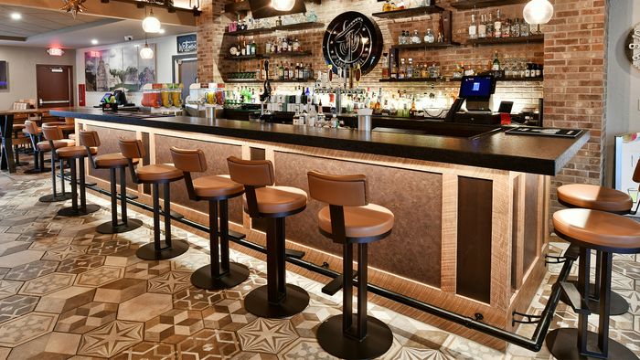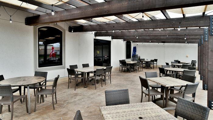 The interior boasts a variety of dramatic lighting, bold artwork, a divider wall made of bright glass block, an interior pergola over communal seating, and lots of comfortable booths and free-standing seating to accommodate approximately 250 patrons. Additional features include a rustic bar with distressed brick back display, custom-made 8-foot entry doors, and an outdoor patio.