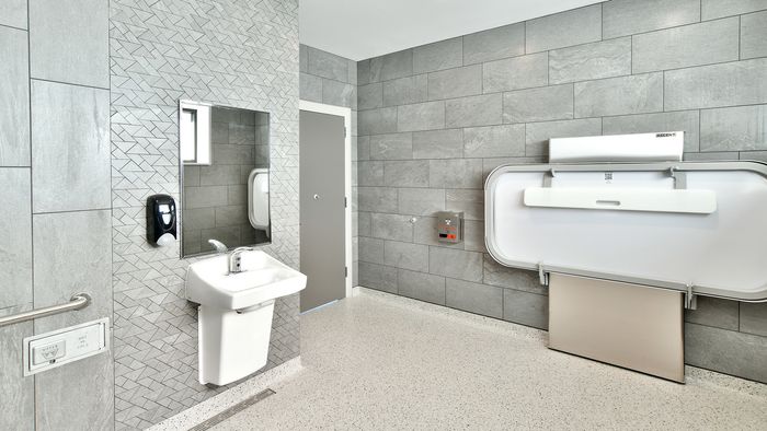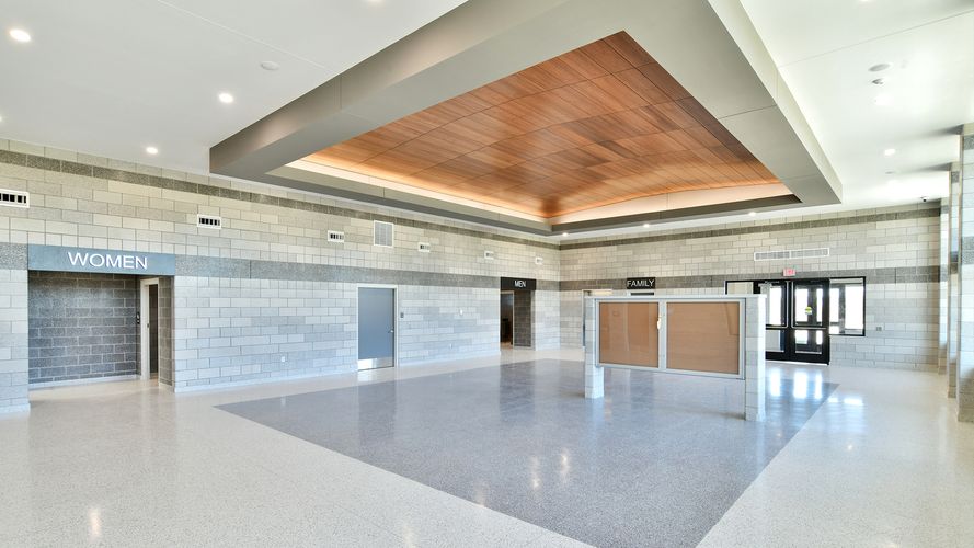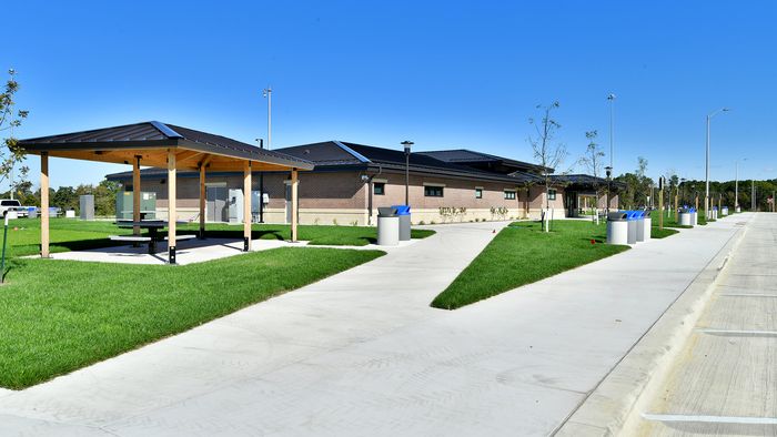 Inside the rest stop, visitors will find modern finishes with in-floor heating in the lobby and terrazzo flooring throughout. Much of the interior is a decorative, burnished CMU (Concrete Masonry Unit) Pattern. The restrooms are ADA-compliant with new family-assist facilities that include powered, height-adjustable adult changing stations. The project has 20 geothermal wells on the west side of the main building.